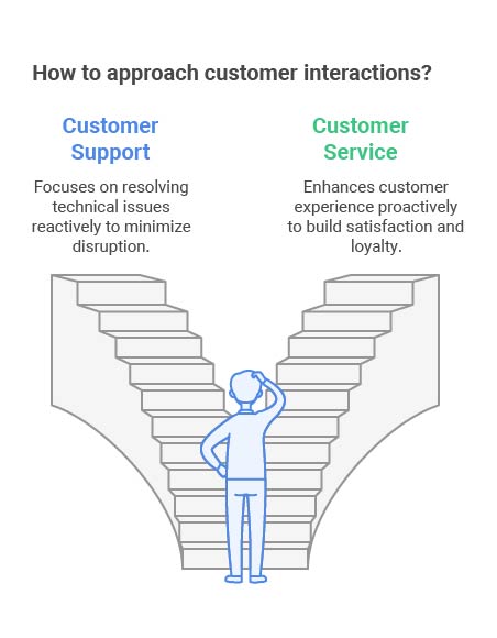 Customer support assists clients with technical problems, product-related concerns, and service difficulties. It takes a reactive approach, addressing issues as they arise..